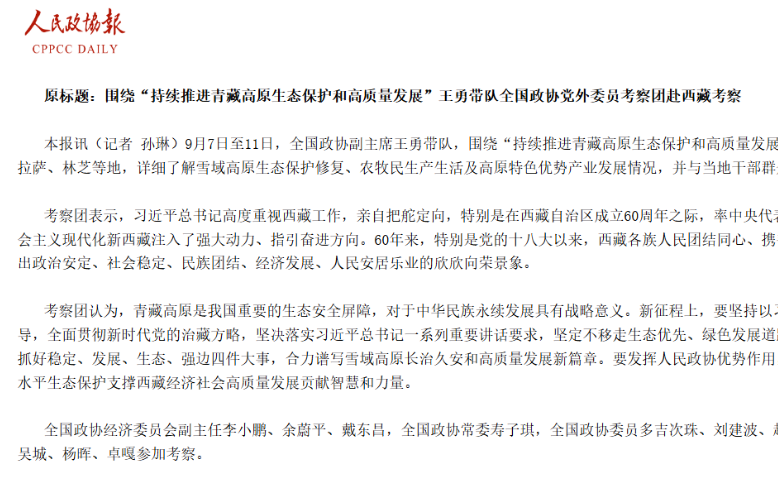 9月7日至11日,全國(guó)政協(xié)副主席王勇帶隊(duì),圍繞“持續(xù)推進(jìn)青藏高原生態(tài)保護(hù)和高質(zhì)量發(fā)展”...